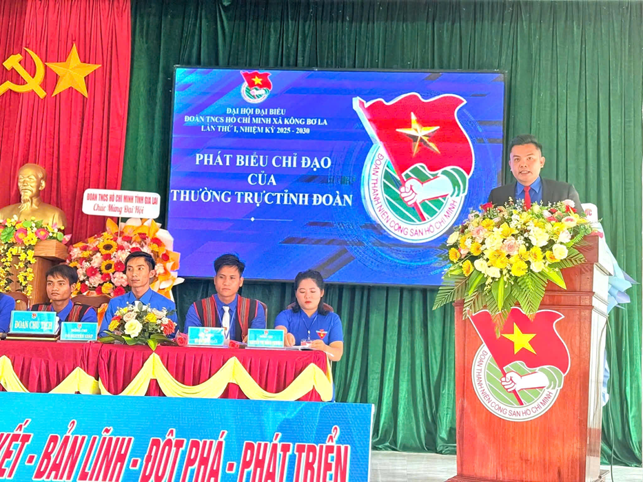 Phát biểu tại Đại hội, đồng chí Phạm Hồng Hiệp - Phó Chủ tịch Ủy ban MTTQ Việt Nam tỉnh, Bí thư Tỉnh đoàn đánh giá cao công tác chuẩn bị chu đáo, nghiêm túc của Đoàn xã và ghi nhận nỗ lực vượt khó của tập thể cán bộ, đoàn viên. Đồng chí nhấn mạnh: “Tinh thần tiên phong, đoàn kết và bản lĩnh chính là chìa khóa để Đoàn xã Kông Bơ La vượt qua giới hạn, khẳng định vị thế của mình trong giai đoạn mới.” Phát huy tinh thần “Tiên phong – Đoàn kết – Bản lĩnh – Đột phá – Phát triển”, đồng chí Phạm Hồng Hiệp cũng định hướng thêm Đoàn xã Kông Bơ La cần tập trung đổi mới nội dung, phương thức hoạt động, phát huy dân chủ, đồng thời chú trọng bồi dưỡng kỹ năng, lý luận chính trị cho cán bộ Đoàn. Một hướng đi mang tính đột phá được Tỉnh đoàn gợi mở là lồng ghép gìn giữ bản sắc văn hóa dân tộc Bahnar vào các phong trào thanh niên, tiêu biểu như mô hình “Thi hát bằng tiếng dân tộc Bahnar” – vừa sáng tạo, vừa giúp thế hệ trẻ thêm tự hào và gắn bó với truyền thống quê hương.
