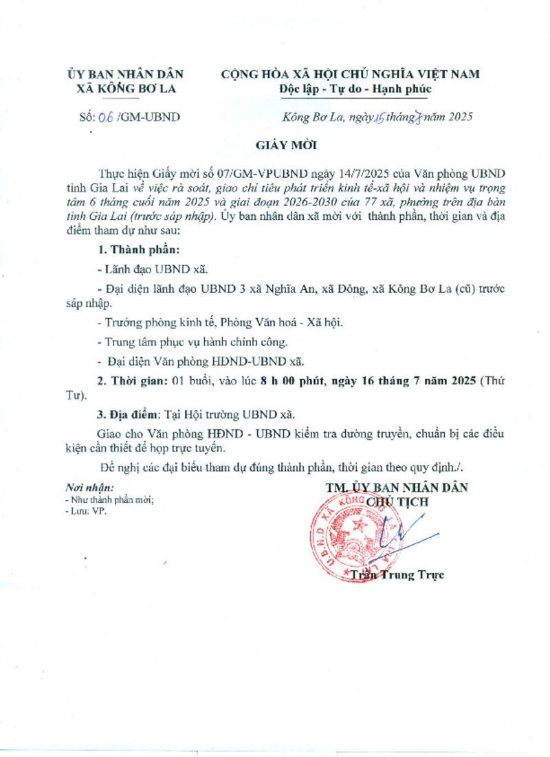 Giấy mời họp số 06-UBND rà soát giao chỉ tiêu kinh tế xã hội và nhiệm vụ trọng tâm 6 tháng đầu năm 2025 22/09/2025, 17:00:33 - Lượt xem: 11 Tweet Thêm vào danh sách Báo xấu Thông tin tài liệu Giấy mời họp số 06-UBND rà soát giao chỉ tiêu kinh tế xã hội và nhiệm vụ trọng tâm 6 tháng đầu năm 2025