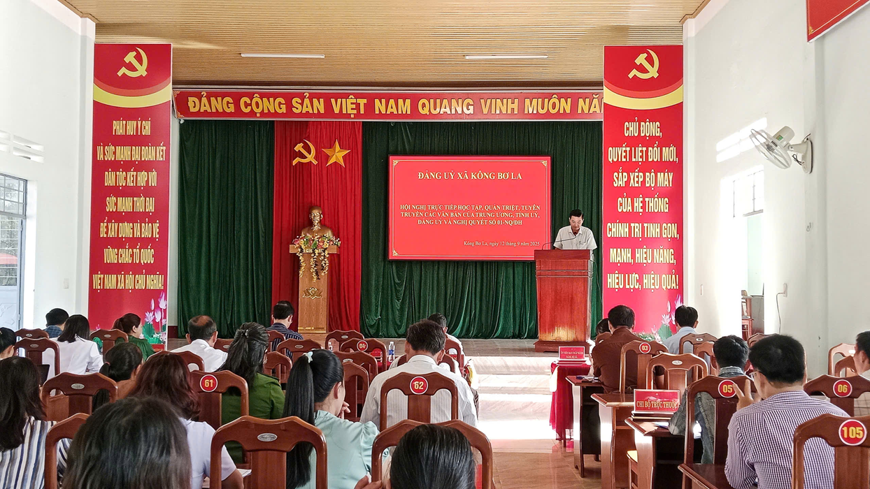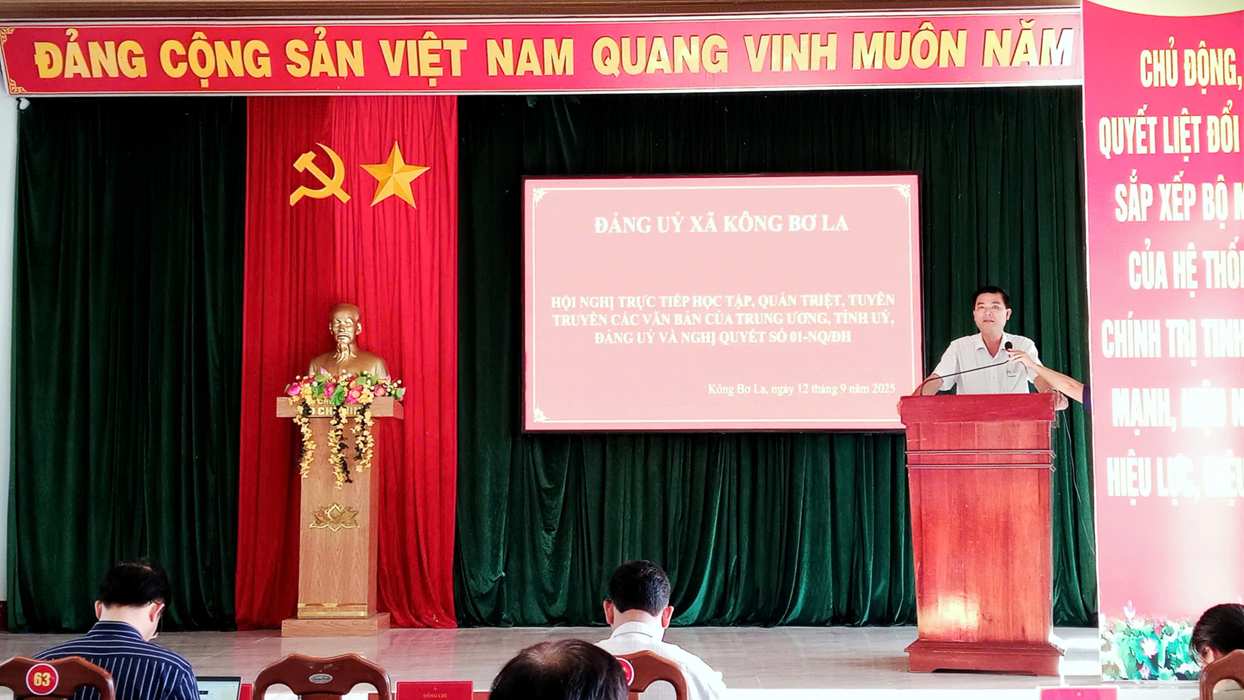 (1) Đồng chí Y Phương – Phó Bí thư Thường trực Đảng uỷ xã đã trực tiếp quán triệt Nghị quyết số 01-NQ/ĐH, ngày 13/8/2025 của Đại hội đại biểu Đảng bộ xã Kông Bơ La lần thứ I, nhiệm kỳ 2025–2030 và Kế hoạch số 10-KH/ĐU, ngày 14/8/2025 của Ban Thường vụ Đảng uỷ về thực hiện Nghị quyết số 57-NQ/TW, ngày 22/12/2024 của Bộ Chính trị về đột phá phát triển khoa học, công nghệ, đổi mới sáng tạo và chuyển đổi số quốc gia nhằm triển khai thực hiện Nghị quyết một cách đồng bộ, có lộ trình rõ ràng, sát với tình hình thực tế địa phương.