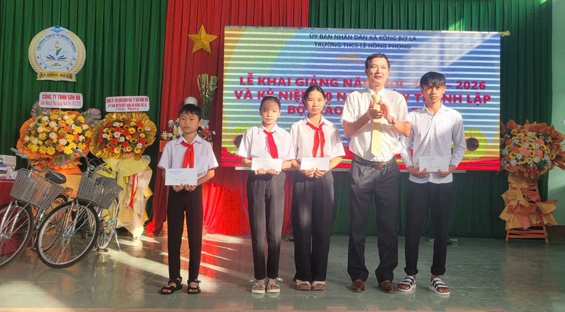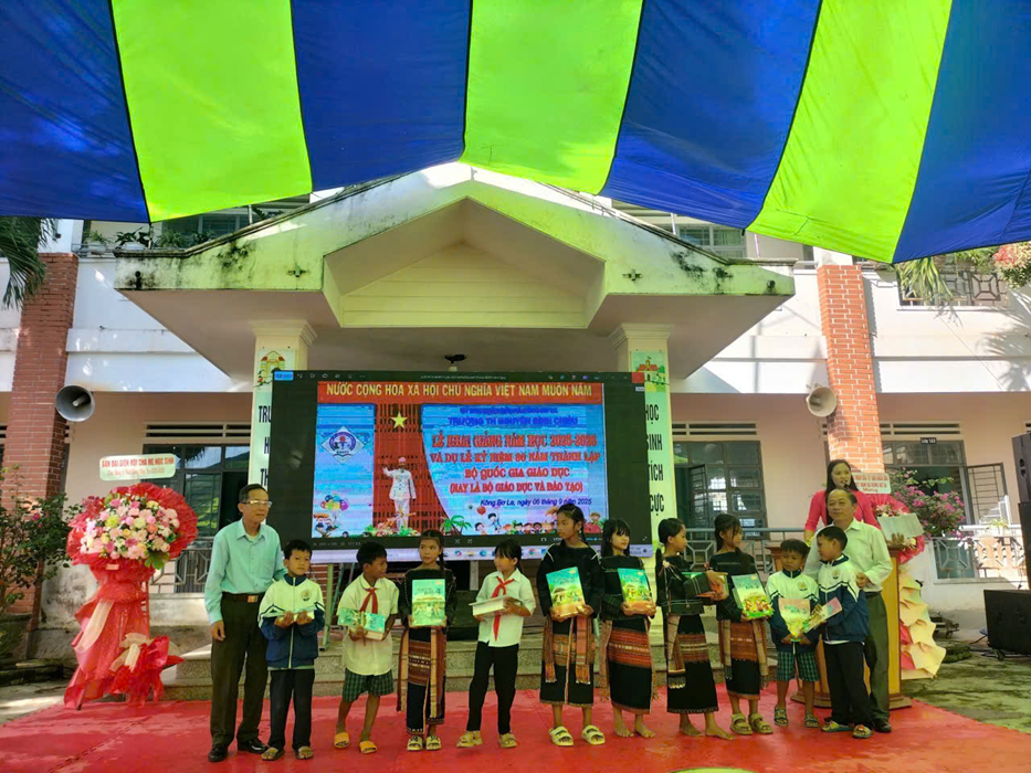 Tại buổi lễ khai giảng, cấp ủy, chính quyền địa phương, các cơ quan, đơn vị, nhà hảo tâm đã trao những phần quà thiết thực cho các em học sinh có hoàn cảnh khó khăn. Đây là hành động cụ thể, thiết thực, tạo thêm động lực cho các em học sinh và phụ huynh vượt qua khó khăn, nỗ lực vươn lên học tập, rèn luyện, phấn đấu trở thành người có ích với cộng đồng, xã hội. Đảng uỷ - HĐND - UBND - UBMTTQVN xã tặng 11 suất quà cho 11 đơn vị trường (mỗi suất 1.500.000đ), Quỹ Khuyến học xã trao 43 suất học bổng (mỗi suất 200.000 đồng), Ngân hàng Agribank chi nhánh Kbang – Đông Gia Lai trao 10 suất học bổng (mỗi suất 500.000 đồng) dành cho các em vượt khó, tiêu biểu. Bên cạnh đó, nhiều cá nhân, đơn vị và doanh nghiệp cũng đã đóng góp thiết thực cho mùa khai giảng bằng những món quà ý nghĩa: gần 2.000 cuốn vở, hơn 600 cây bút, trên 150 bộ sách giáo khoa và tài liệu học tập các cấp, 145 bộ sách tiếng Anh, 178 vở Mỹ thuật, cùng hệ thống âm thanh và màn hình LED, 9 chiếc xe đạp và nhiều suất học bổng với tổng trị giá lên tới hàng chục triệu đồng.