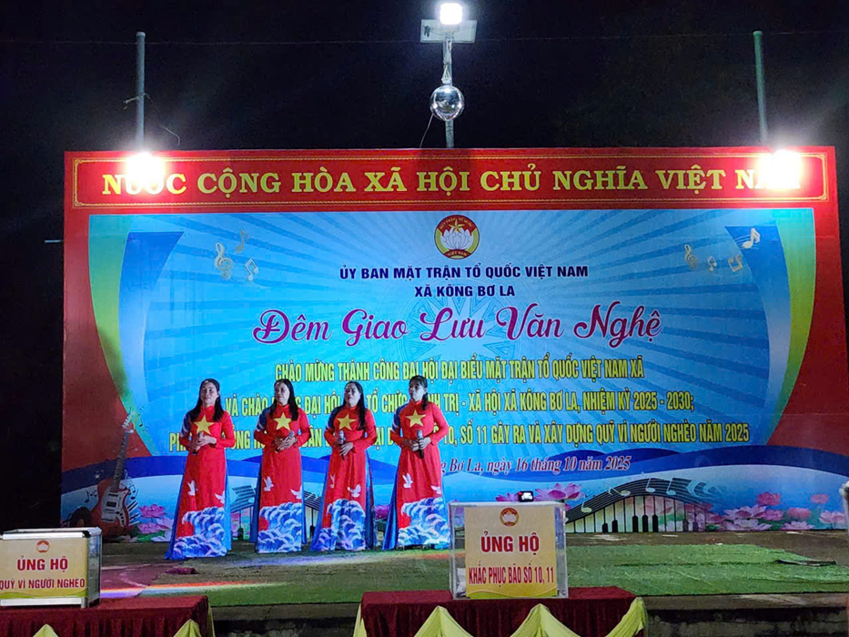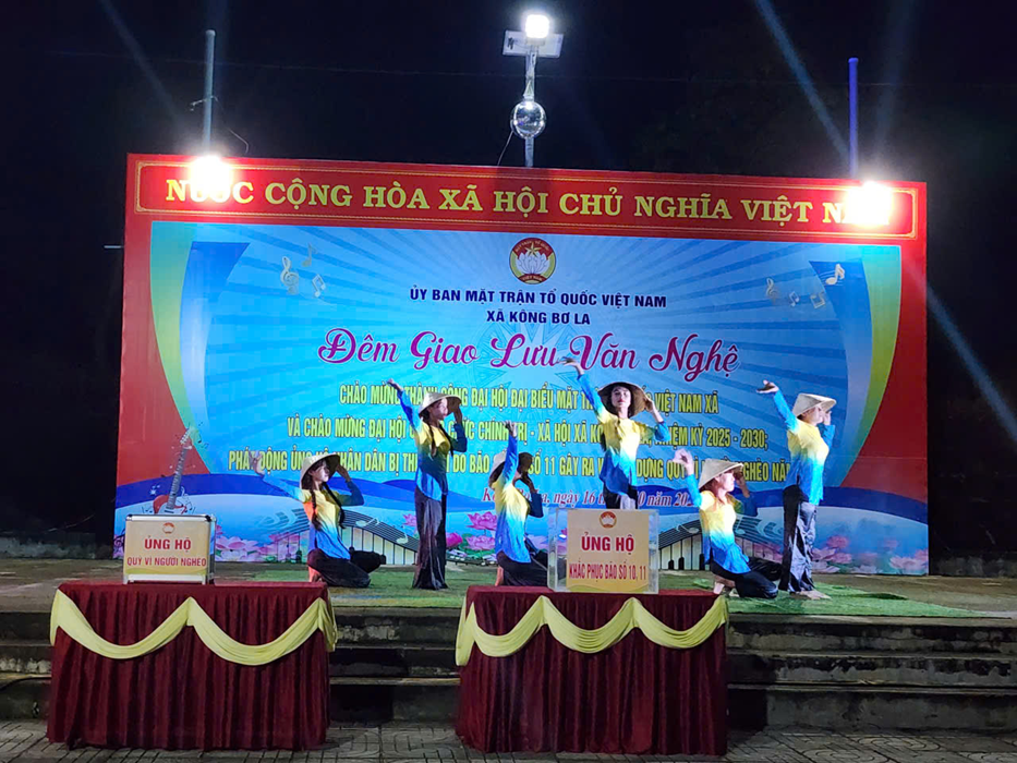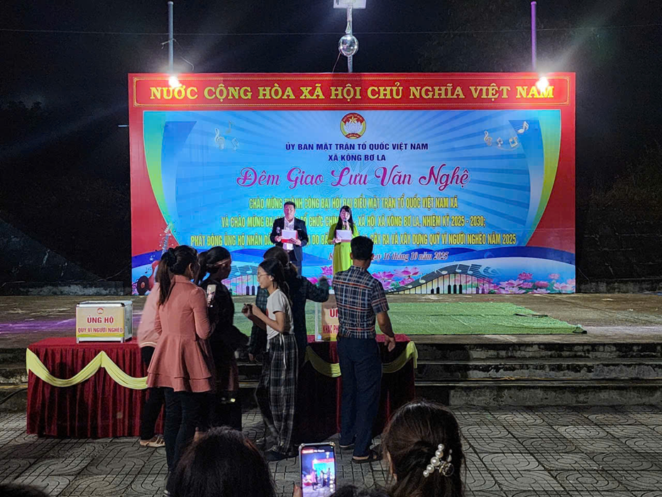 Phát biểu khai mạc chương trình, bà Đinh Thị Côi – Chủ tịch Ủy ban MTTQ Việt Nam xã Kông Bơ La, Trưởng ban vận động cứu trợ xã, xúc động nói: “Đêm nay, chúng ta không chỉ hát, mà đang cùng nhau gửi gắm tấm lòng nhân ái, sẻ chia với đồng bào đang chịu thiên tai, và với những hộ nghèo quanh ta vẫn đang nỗ lực từng ngày để vươn lên. Mỗi sự ủng hộ, dù nhỏ, đều mang ý nghĩa to lớn – là hơi ấm của tình người.”