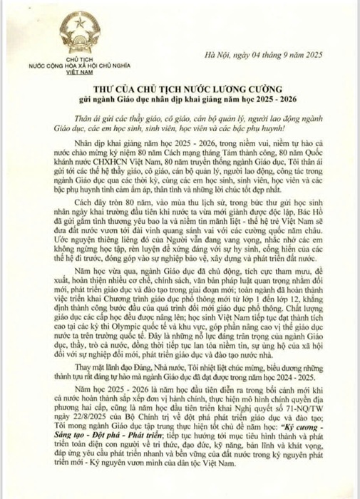 Nhân dịp khai giảng năm học mới 2025 - 2026, trong niềm vui, niềm tự hào cả nước chào mừng kỷ niệm 80 năm Cách mạng Tháng Tám thành công, 80 năm Quốc khánh nước CHXHCN Việt Nam, 80 năm truyền thống ngành Giáo dục, Tôi thân ái gửi tới các thầy giáo, cô giáo, cán bộ quản lý, người lao động công tác trong ngành Giáo dục qua các thời kỳ, cùng các em học sinh, sinh viên, học viên và các bậc phụ huynh tình cảm ấm áp, thân tình và những lời chúc tốt đẹp nhất.