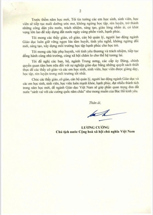 Trước thềm năm học mới, Tôi tin tưởng các em học sinh, sinh viên, học viên sẽ tiếp tục nuôi dưỡng ước mơ, không ngừng học tập, rèn luyện, trở thành những công dân yêu nước, trách nhiệm, sáng tạo, giàu lòng nhân ái, có khát vọng lớn lao để xây dựng đất nước ngày càng phồn vinh, hạnh phúc.